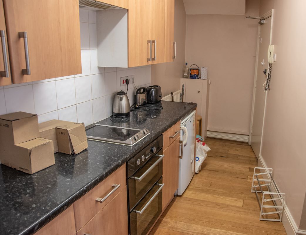 Entrance area, open plan lounge/kitchen, bedroom, bathroom.