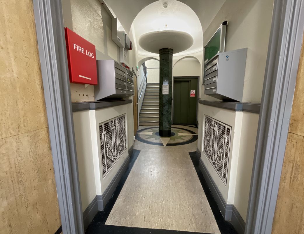 Communal entrance having a lift and staircase to upper floors.