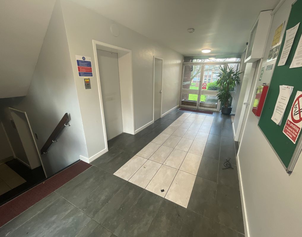 Communal entrance area having stairs and lift giving access to upper floors: