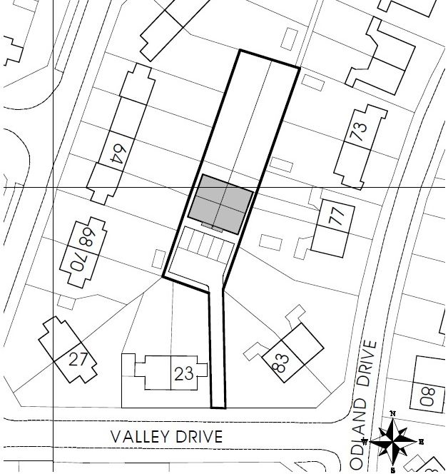 Access to the land can be made via a driveway to the side of No.23 Valley Drive. The land itself is rectangular in shape and has the benefit of planning permission for two dwellings.
