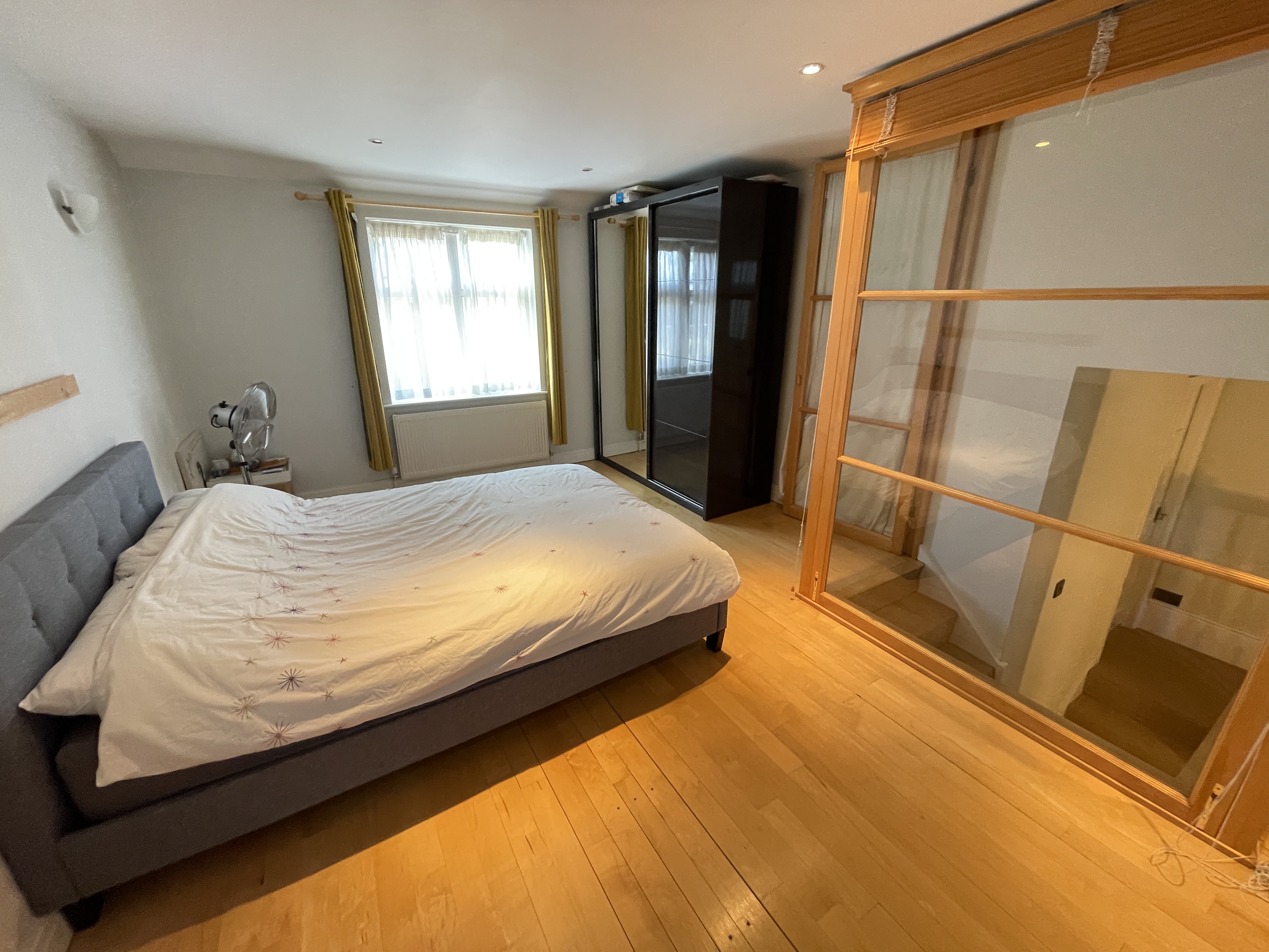 Bedroom two - laminate flooring, UPVC double glazed window, gas central heating radiator, power points, and suspended lighting. Stairs leading down to first floor lobby