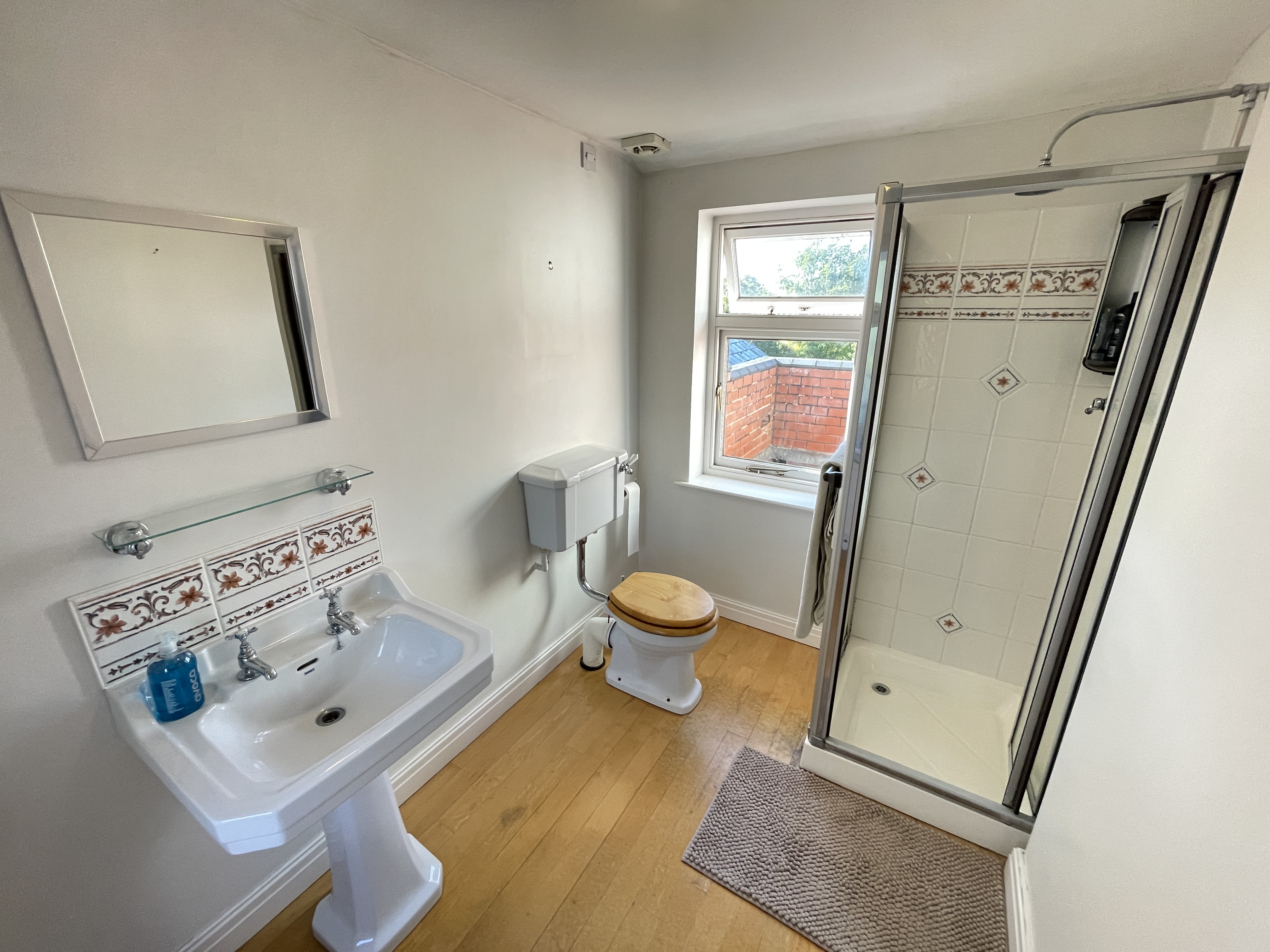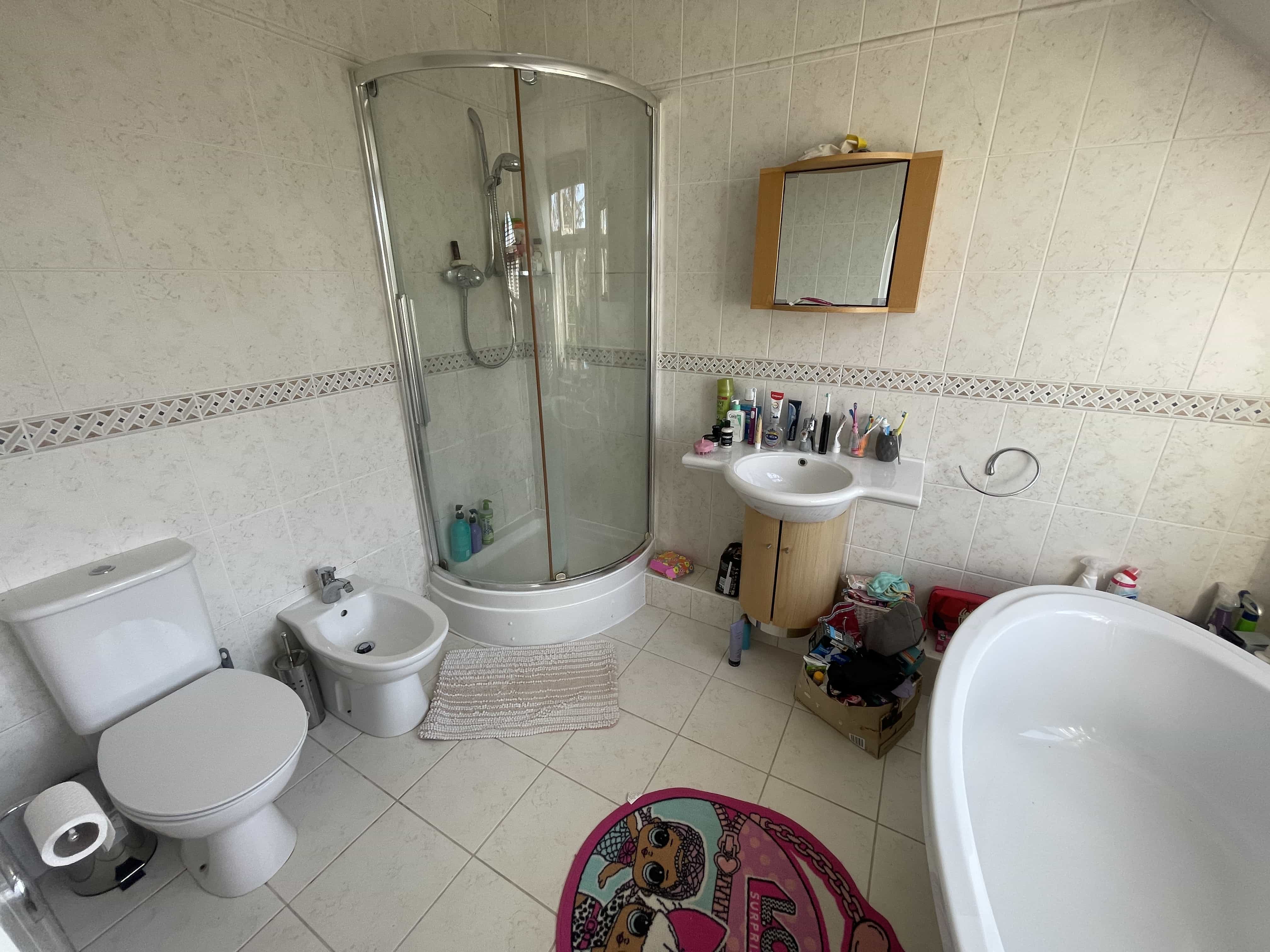Bedroom one – carpet flooring, UPVC double glazed window, gas central heating radiator, power points, suspended lighting, and en-suite with pedestal wash hand basin, shower cubicle and WC.