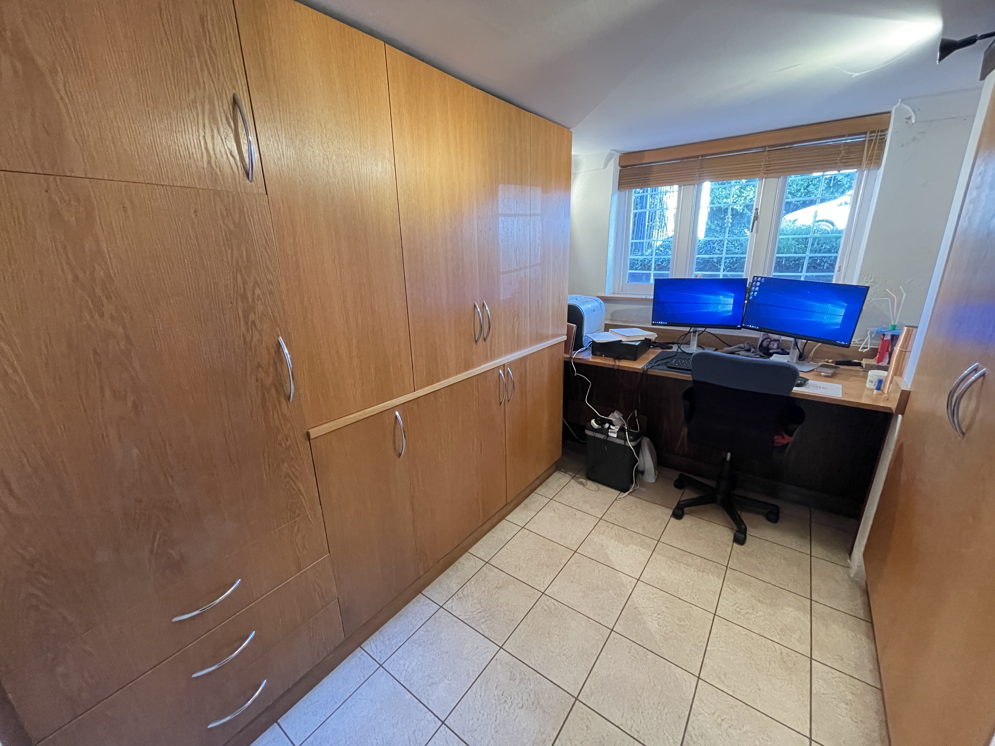 Study - Tiled flooring, integrated wall storage, UPVC double glazed windows, gas central heating radiator, power points