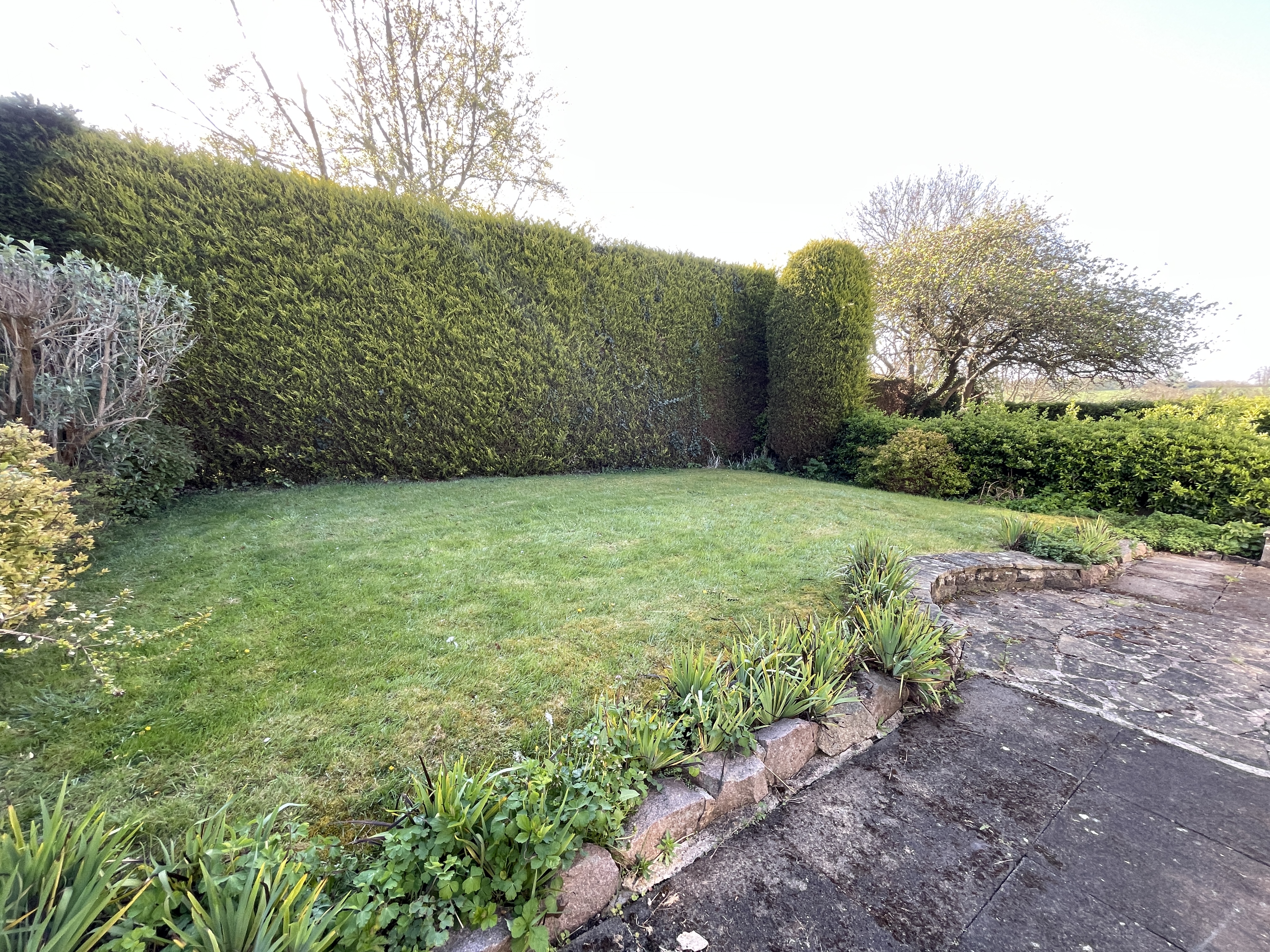 Outside: Garden with patio and otherwise laid to lawn.