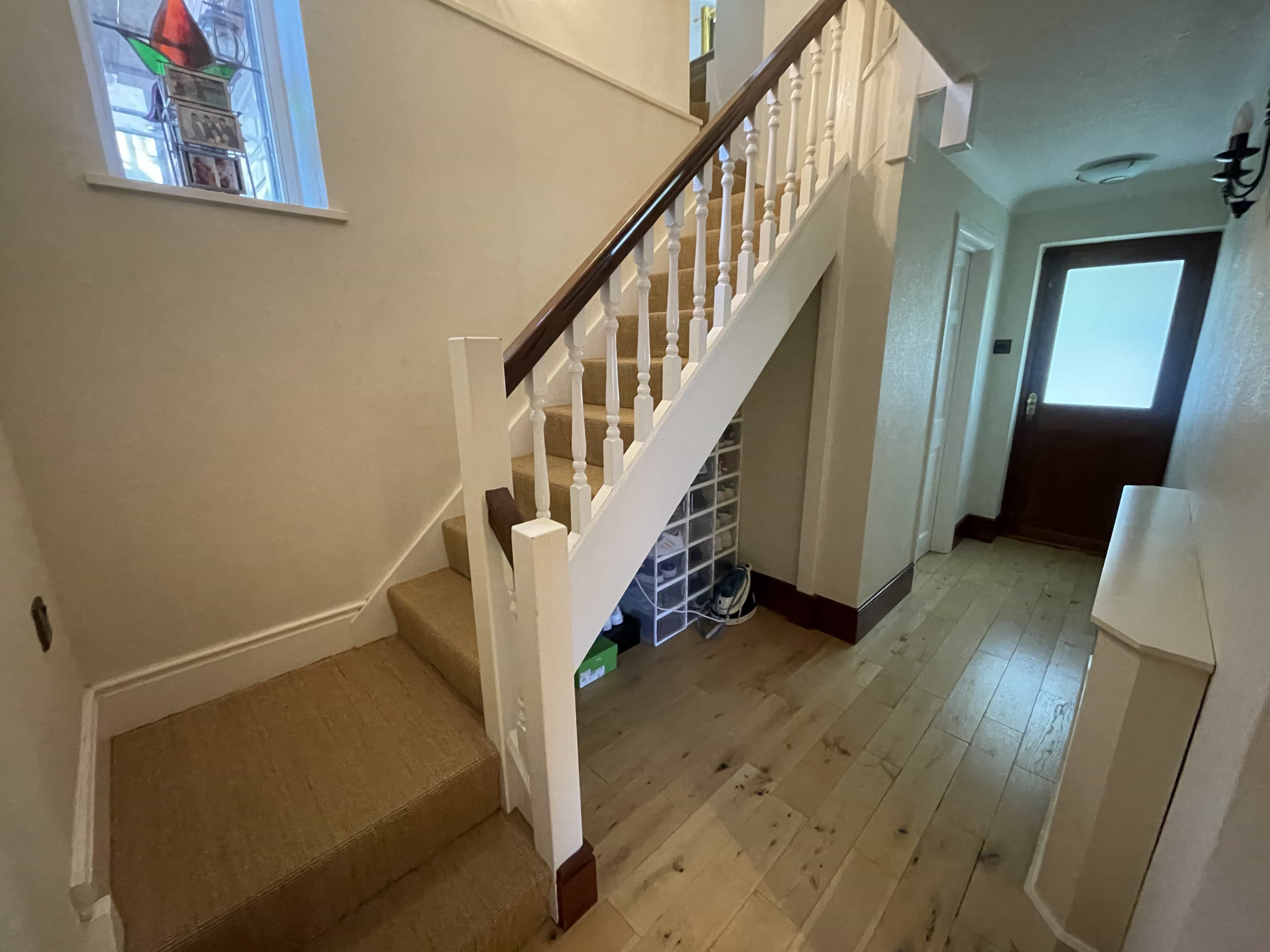 Entrance hallway – Having wood effect tiled flooring, gas central heating radiator, power points, staircase off to the first floor.