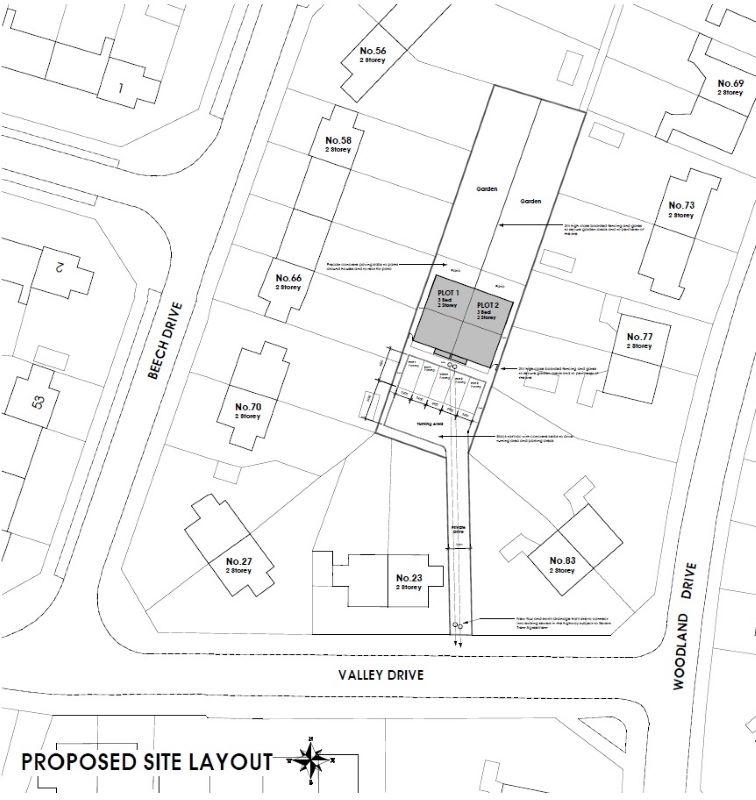 Access to the land can be made via a driveway to the side of No.23 Valley Drive. The land itself is rectangular in shape and has the benefit of planning permission for two dwellings.